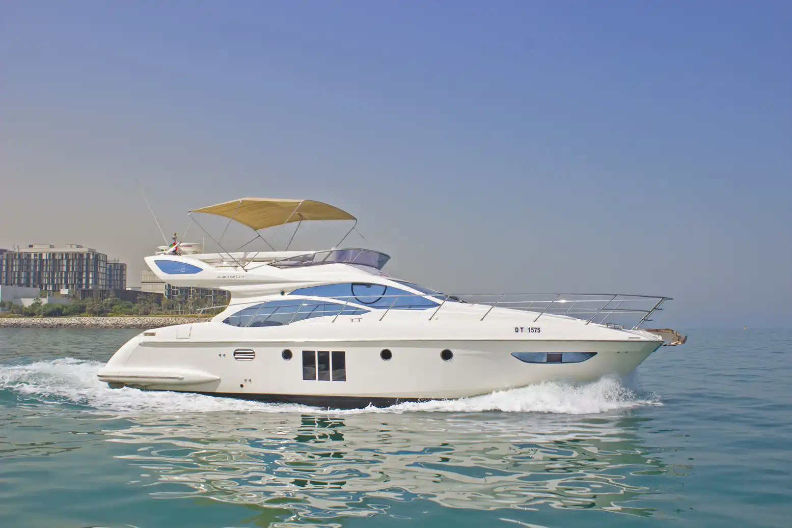 A sleek 50ft Azimut motor yacht with air-conditioned saloon, private cabin, flybridge, and hydraulic swimming platform. One of our most popular choices for birthday celebrations and romantic sunset cruises.